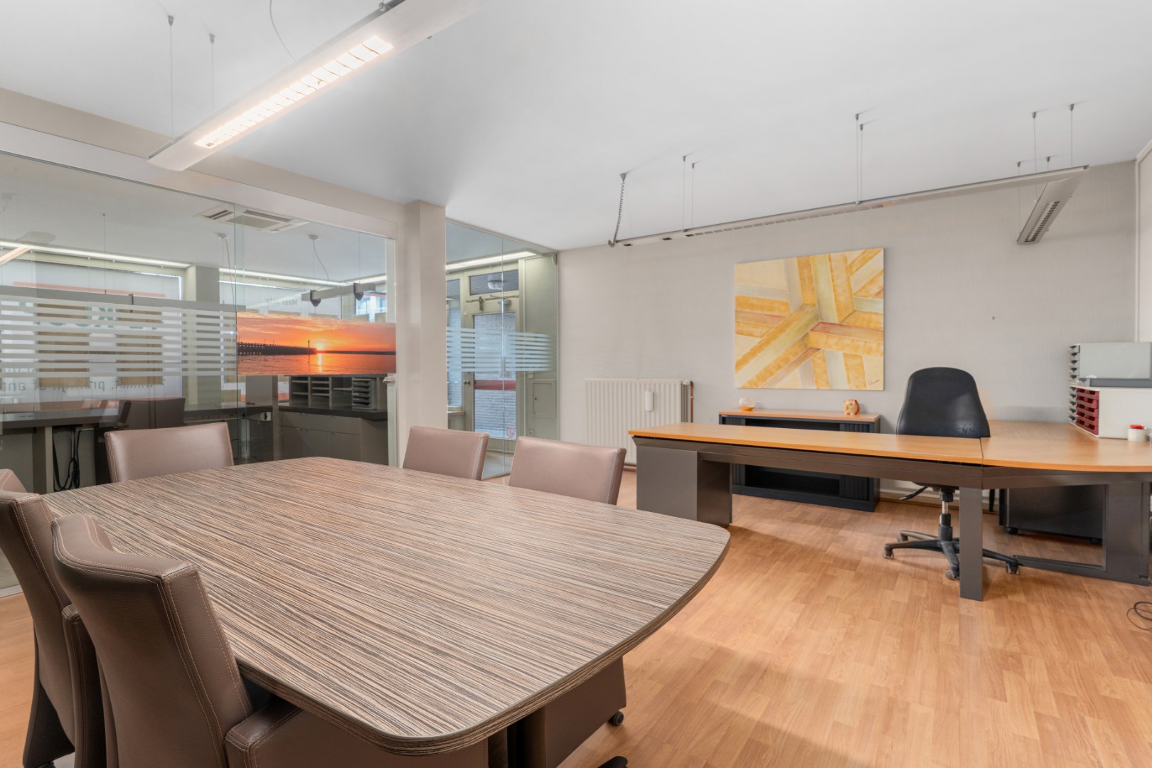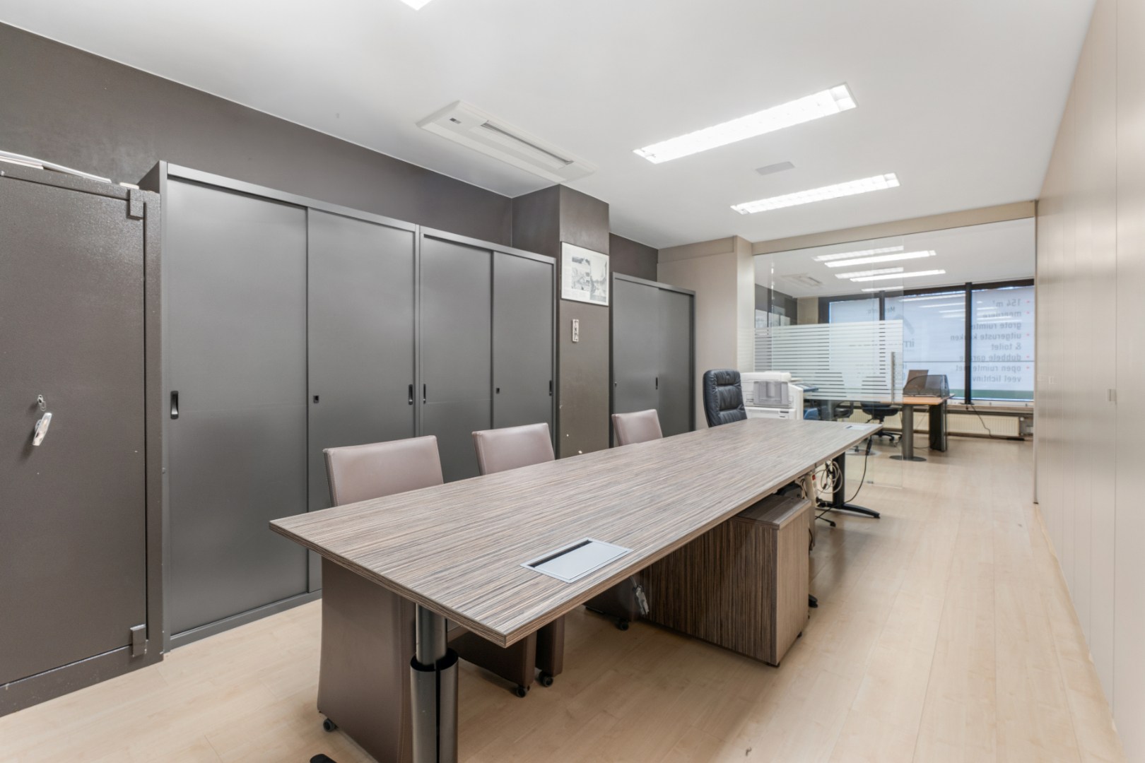 Het pand beschikt over vier grote bureauruimtes, een uitgeruste keuken, een apart toilet en een dubbele garage, wat zorgt voor extra comfort en praktische mogelijkheden.