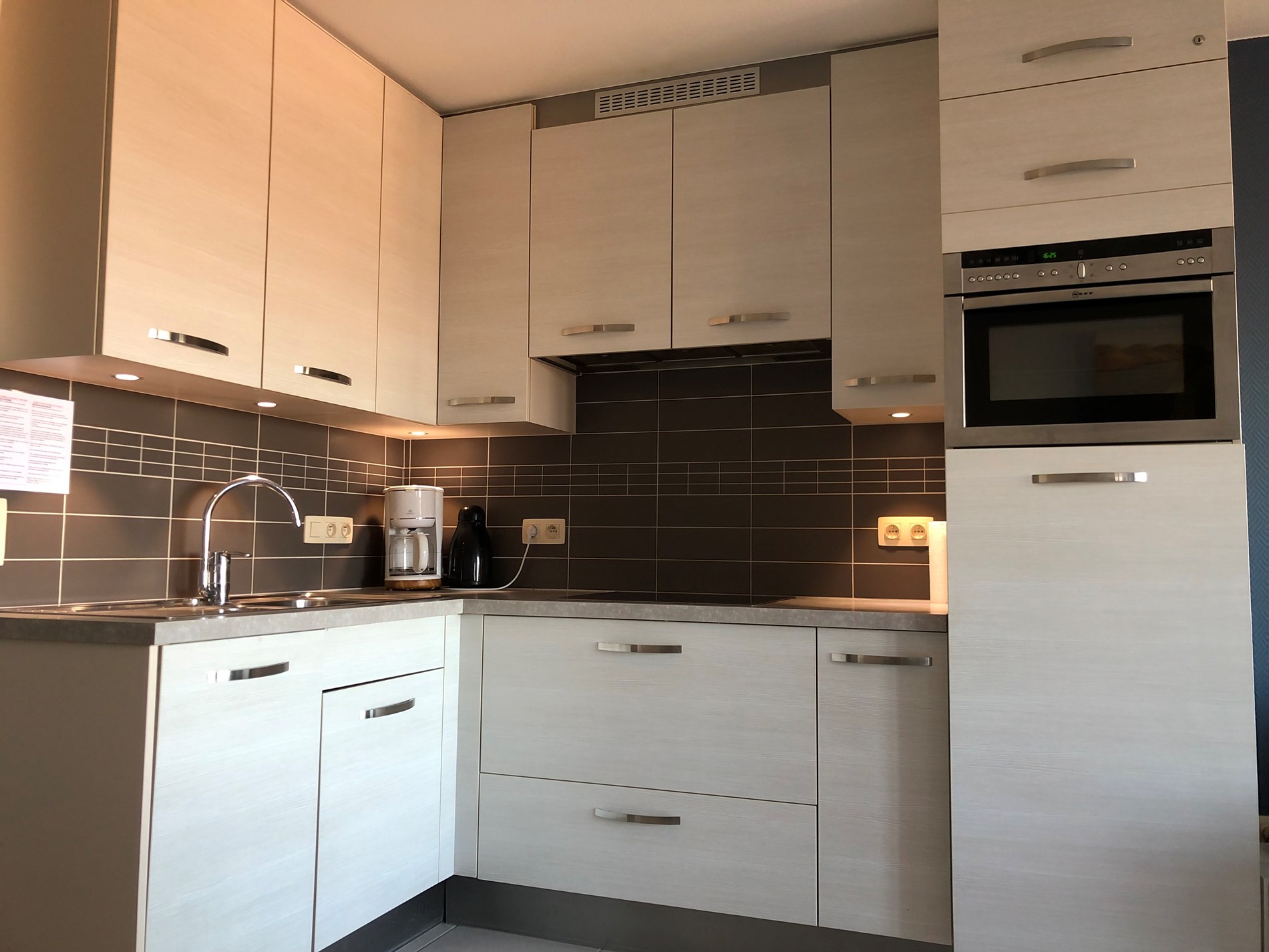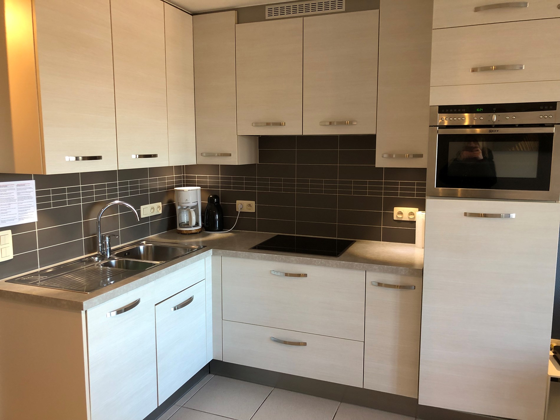 Modern apartment located on 150 m. from the sea with 2 bedrooms: 1 double bed and 1 pull-out bed 2 P, living room with terrace, open-plan kitchen with microwave and dishwasher, bathroom with shower, washbasin and toilet, 5th floor with elevator. Communal bike shed. Accumulation Stove. Only small pets allowed. There is a DVD and internet connection. Belgacom TV