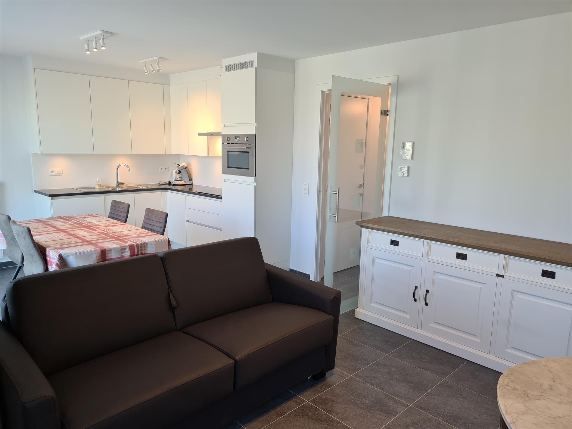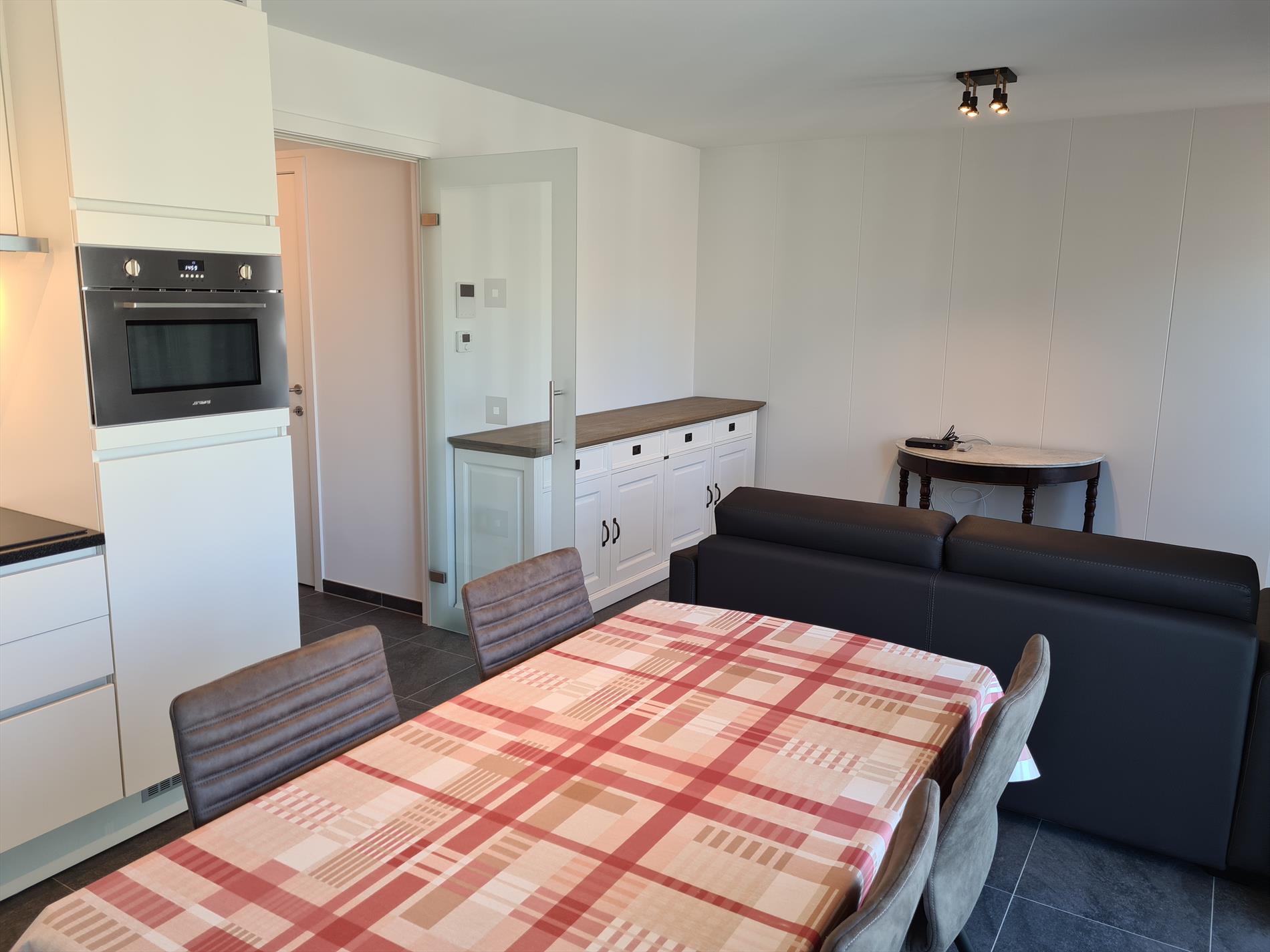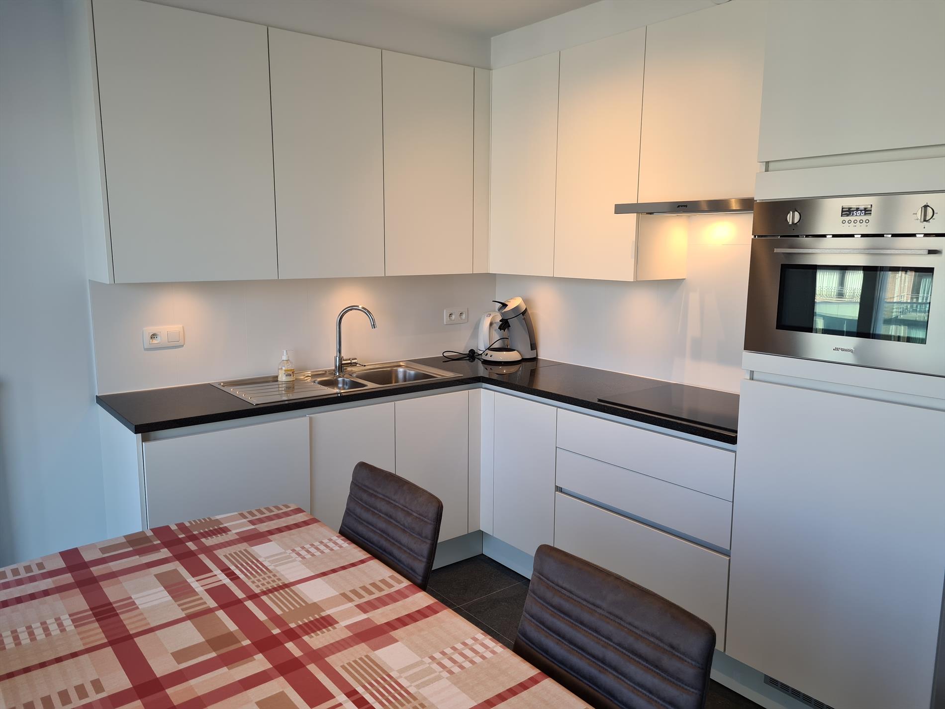 Magnificent new flat with all comforts. Living room with terrace, flat-screen TV, digibox and WIFI. Open kitchen with microwave, dishwasher and vitro-ceramic hob. 1 separate sleeping corner with double bed, living room with sofa bed for 2 persons. Bathroom with walk-in shower and double washbasin. Separate storage room and toilet. Free WIFI! NO pets allowed. Situated at 100 m from the sea.