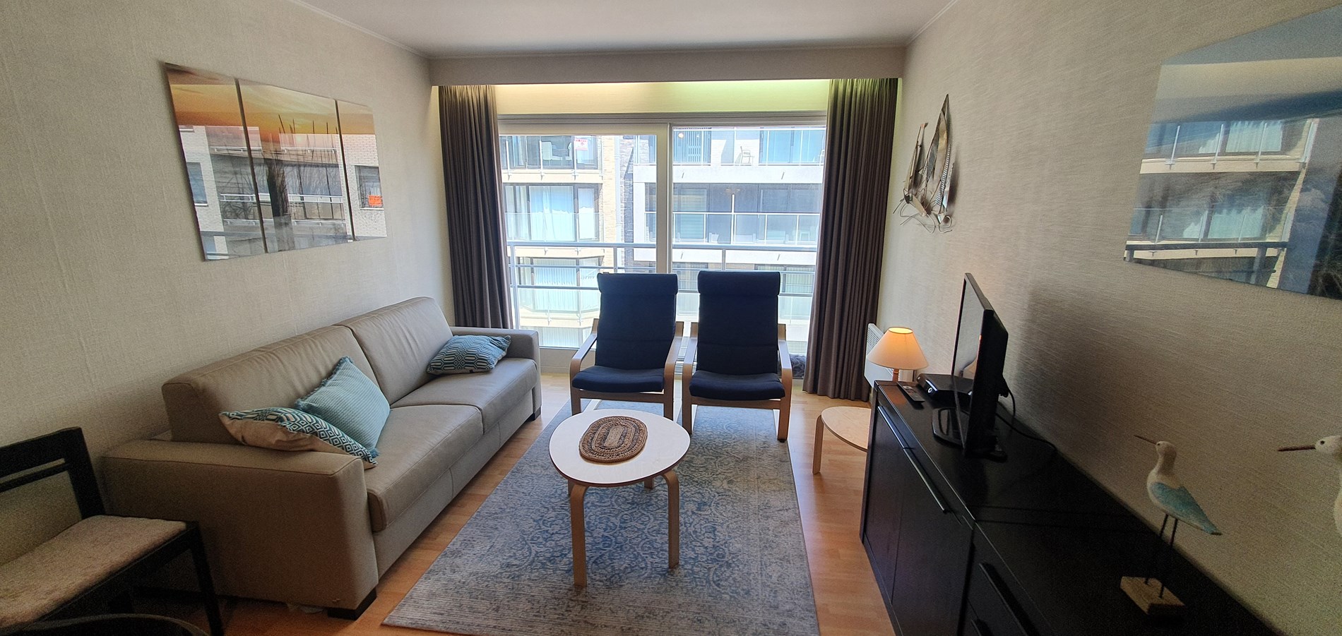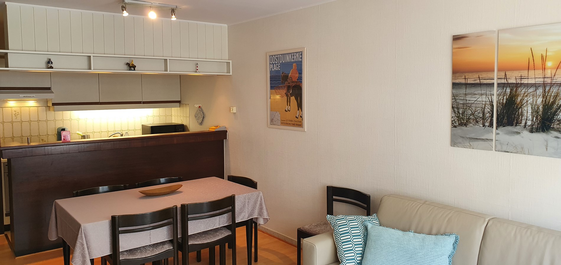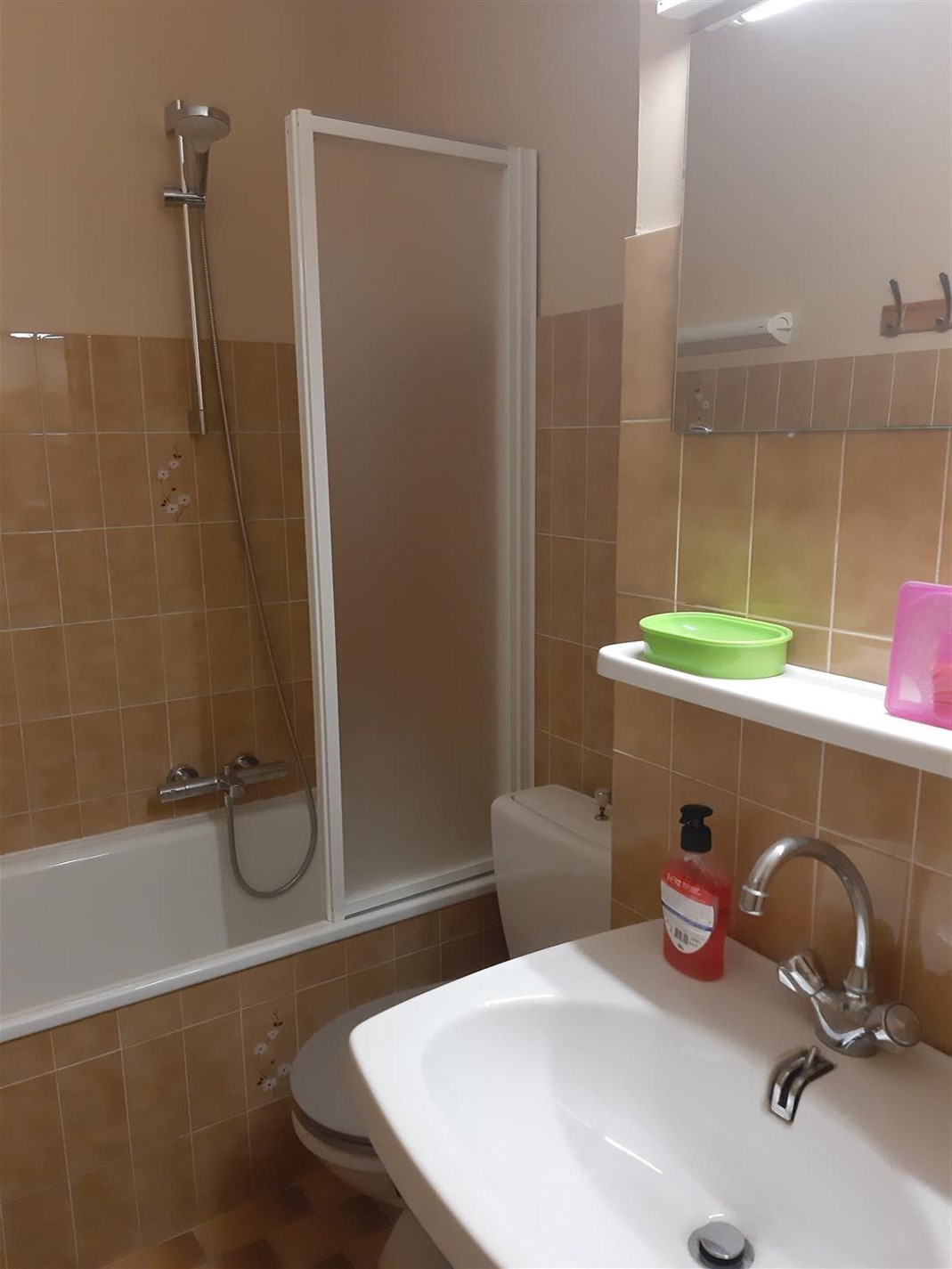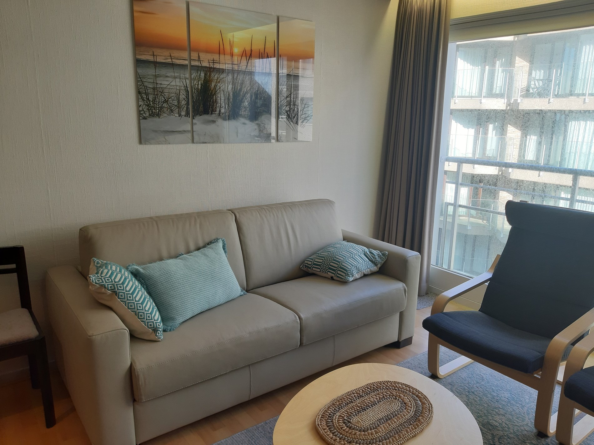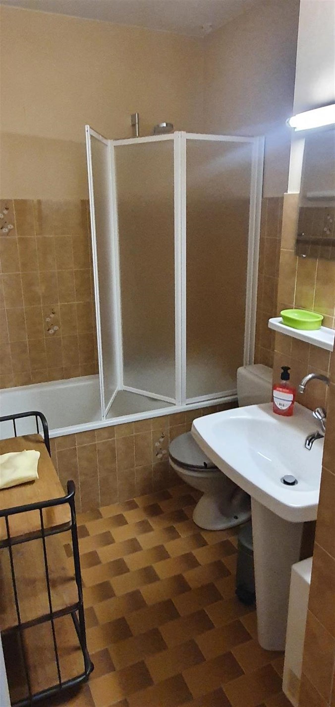 Studio with side sea view at 50 meters from seafront and stores . Layout : entrance hall , living room with open kitchen , bathroom with bath and shower screen and a separate sleeping area with double bed and a sofa bed in the living room .