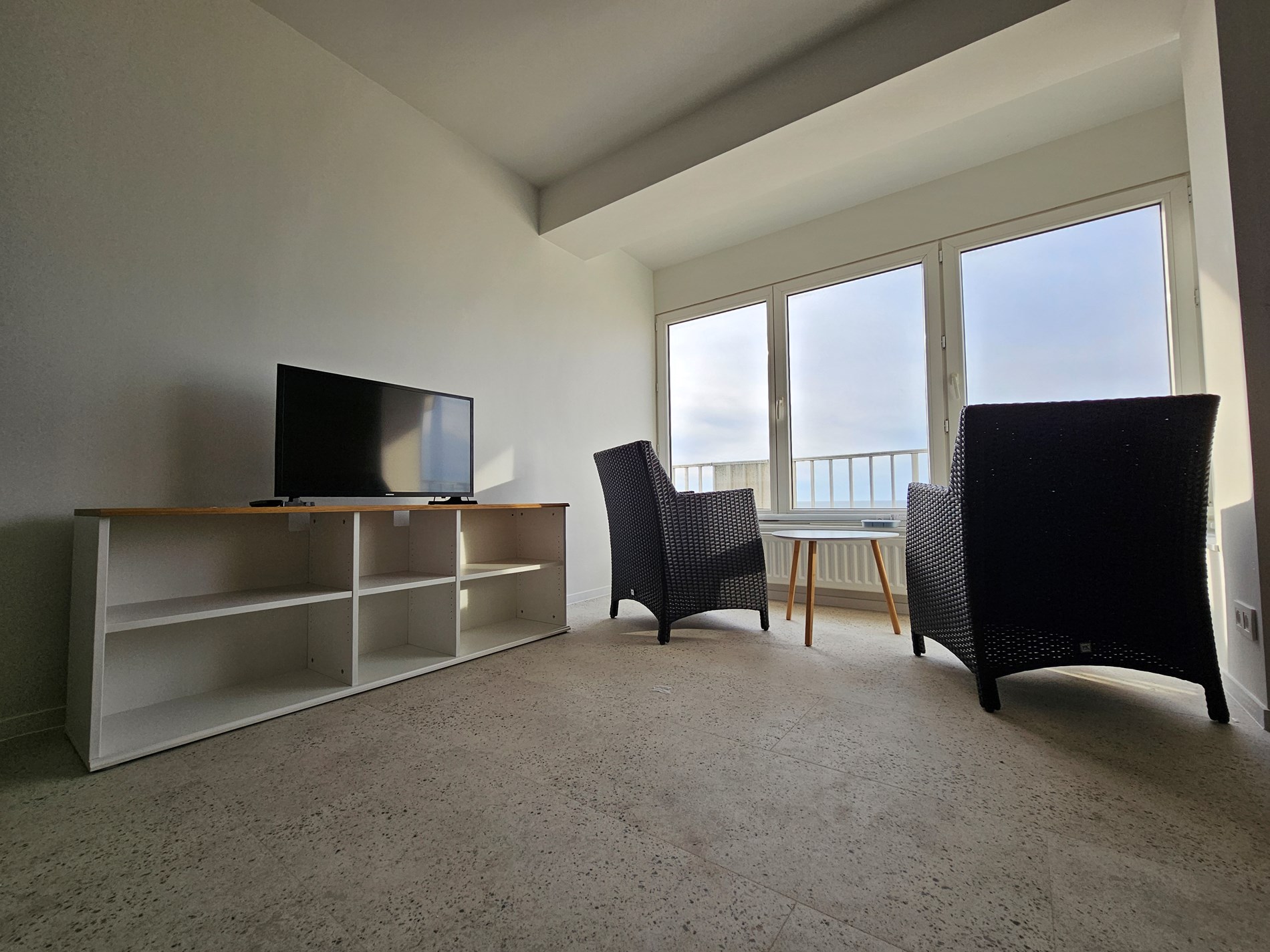 Fully renovated flat with frontal sea views. The flat has living room with sofa bed, fully equipped kitchen with built-in oven, dishwasher, fridge with freezer, induction hob. Bathroom with walk-in shower and sink, separate toilet, bedroom with double bed, wardrobes in entrance hall, rear balcony. 4th floor with lift.