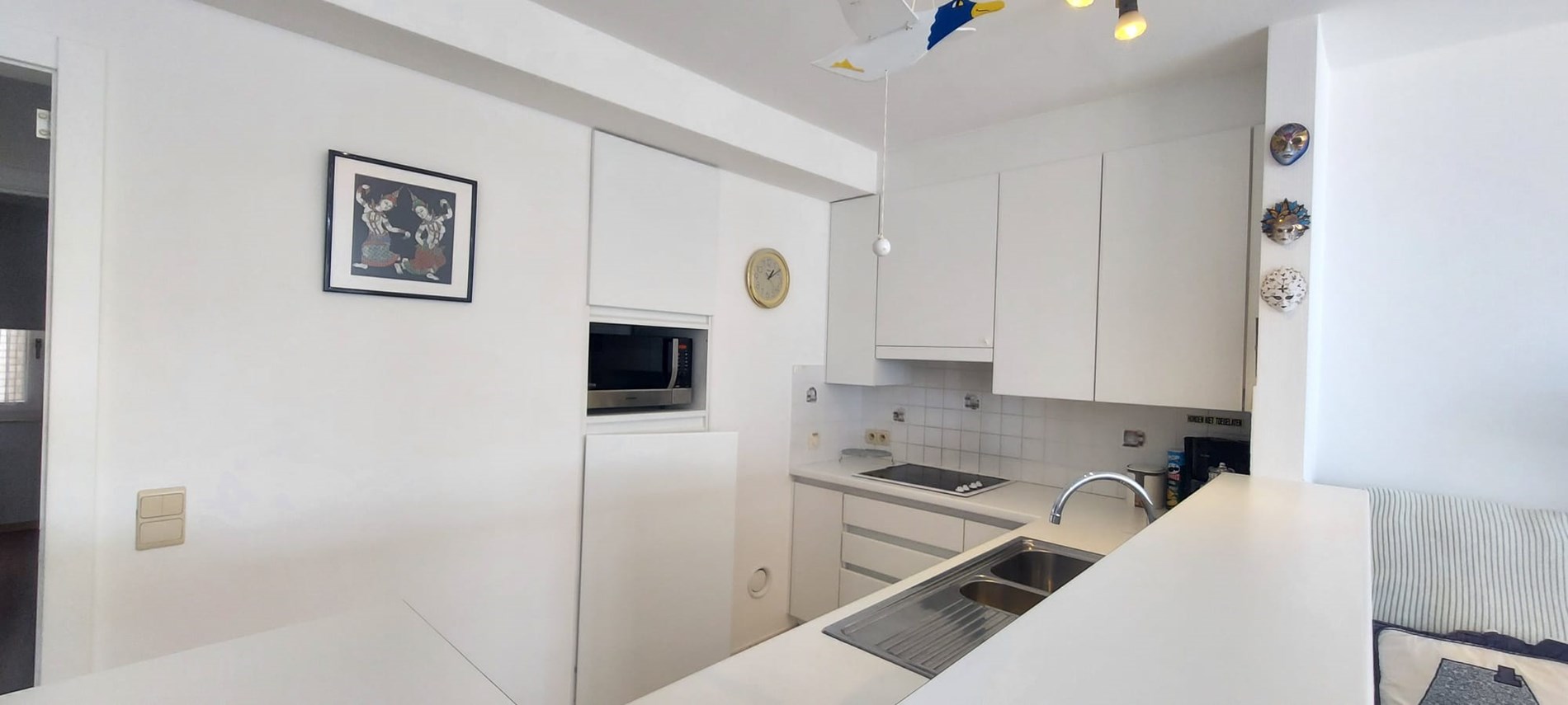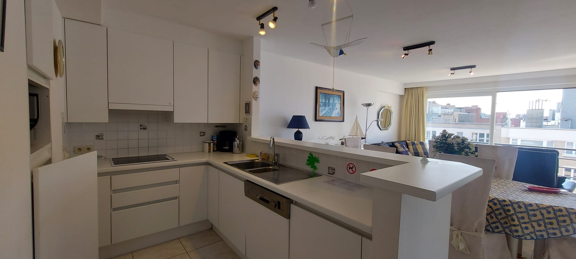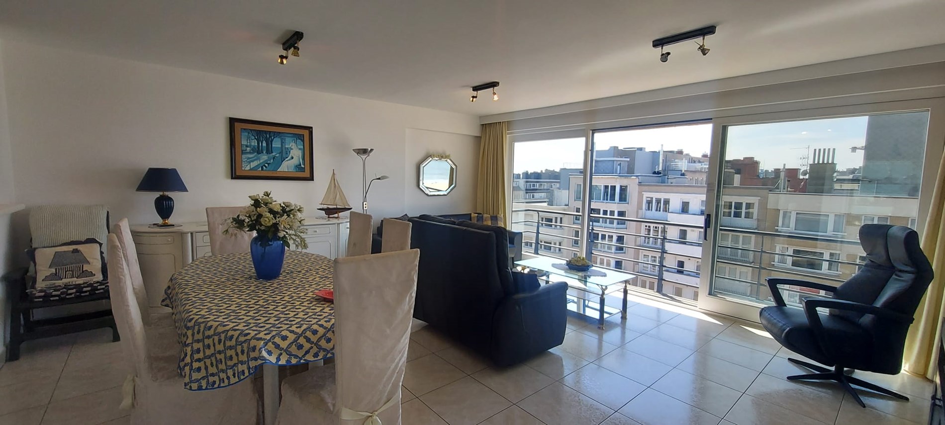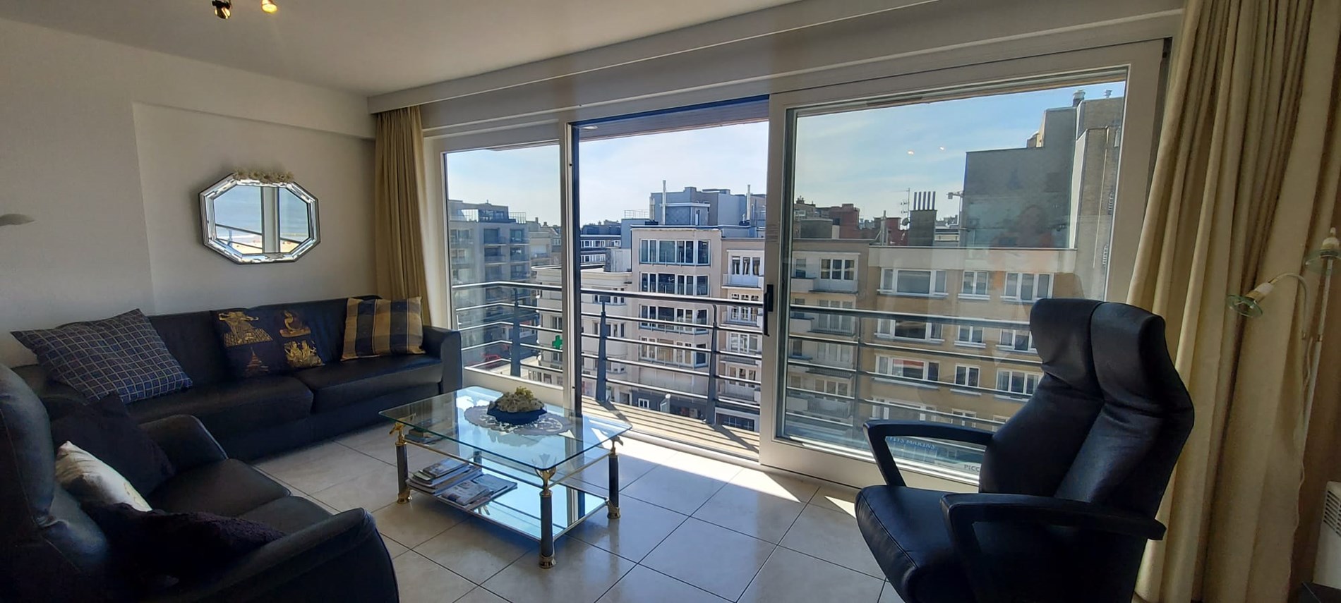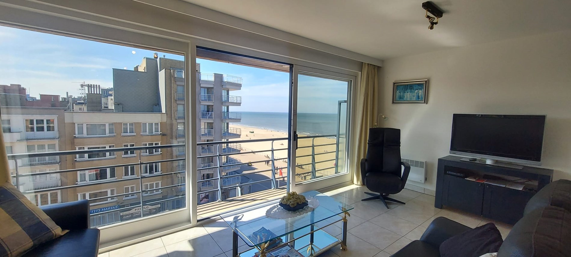 This flat is located on the watch of Koksijde, with fantastic lateral sea view. The flat has a spacious living room with access to the pleasant terrace and sea view, open-plan kitchen fitted with all modern conveniences, bathroom with washbasin and bathtub, separate toilet, cloakroom and two spacious bedrooms with double bed of which one room with ensuite shower. A closed garage located under the seawall is included. No pets allowed.